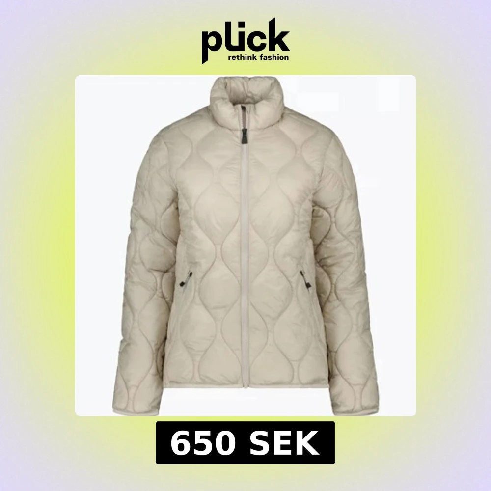 Snygg beige quiltad jacka med dragkedja framtill och hög krage. Jackan har långa ärmar och praktiska fickor med dragkedja. Lite mer silverfärgad i verkligheten. Helt ny med prislapp, nypris 899 kr.
