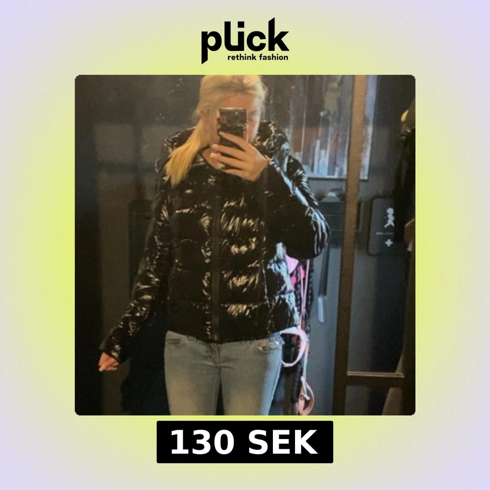 Säljer en svart, glansig pufferjacka med huva och dragkedja framtill. Jackan är quiltad och har en lite oversized look, perfekt för kalla dagar. Den har långa ärmar och en cool, modern vibe som passar till jeans eller andra outfits.