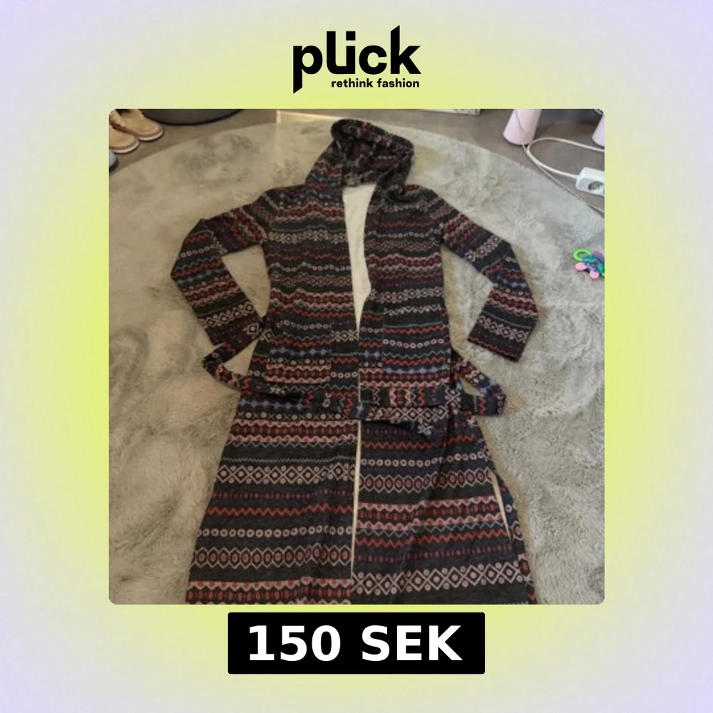 Lång kofta med huva och bälte i midjan. Färgglatt mönster i svart, rött, vitt och blått. Jackan har långa ärmar och två fickor framtill. Perfekt för lager-på-lager och chill dagar.