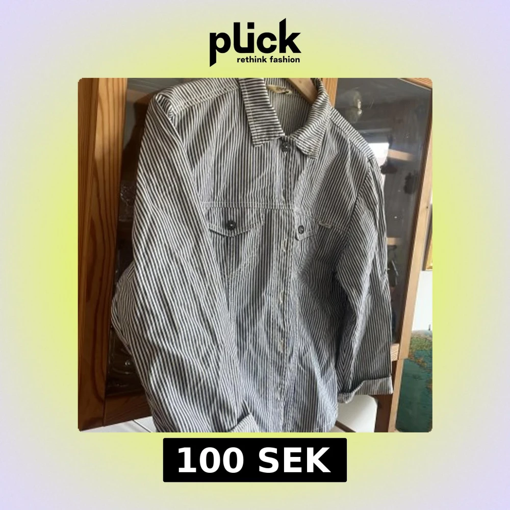 Säljer en randig overshirt/deminjacka från Birgitta i blå och vita ränder. Jackan har långa ärmar och knappar framtill samt på bröstfickorna. Två små fläckar finns (se bild) men går nog bort i tvätten. Perfekt till jeans i vårsolen☀️