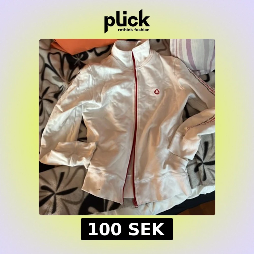 Säljer en vit jacka från Etirel med röd dragkedja och logga. Jackan har långa ärmar och ribbade muddar. Perfekt för en sportig look.