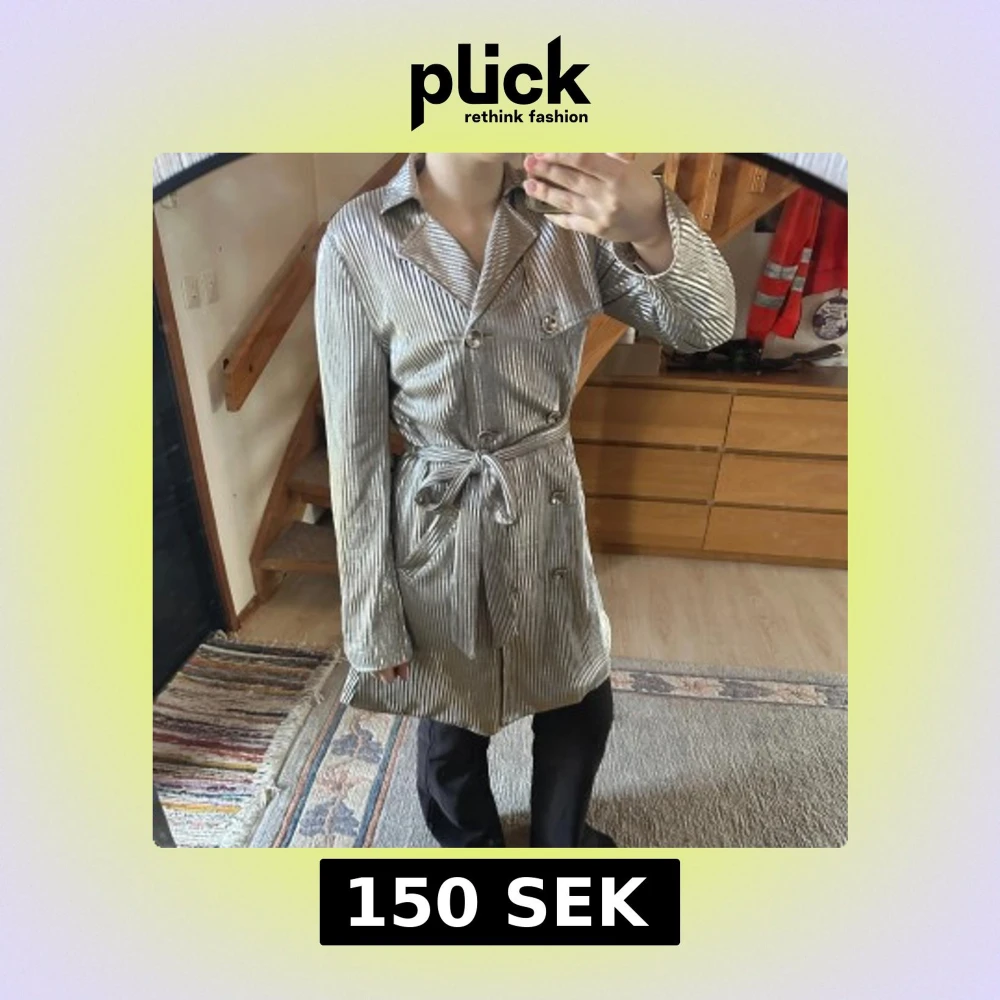 Snygg randig trenchcoat i silver och svart med knytband i midjan. Jackan har långa ärmar och knappar framtill. Perfekt för en stilren look.