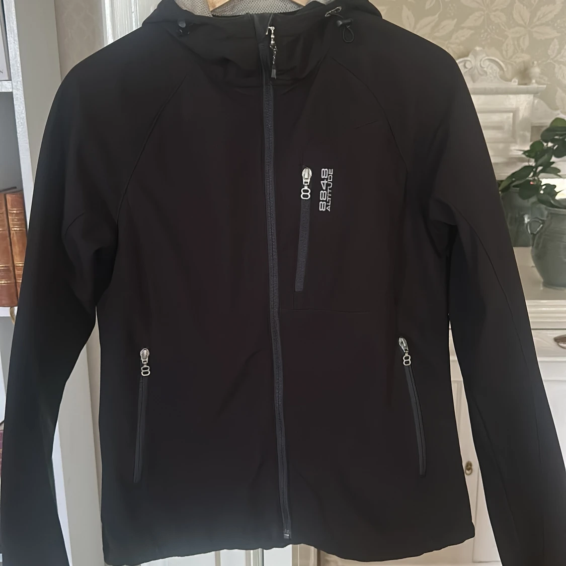 Svart friluftsjacka från 8848 Altitude med huva, hel dragkedja och tre fickor med dragkedja framtill. Jackan har ett fleecefoder på insidan. I väldigt fint skick trots år på nacken.