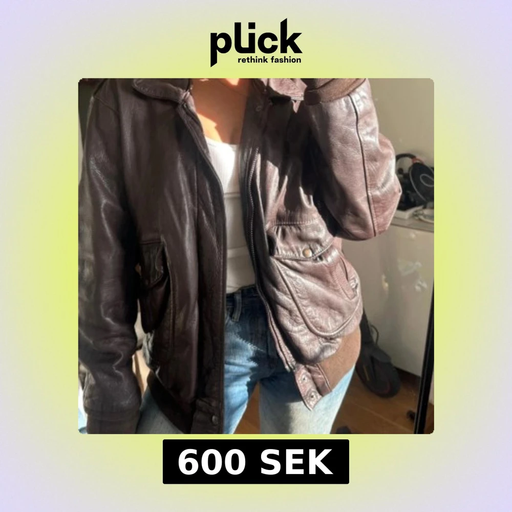 Säljer en brun skinnjacka med coola detaljer som stora fickor med knappar och ribbade muddar vid ärmslut och nederkant. Jackan har krage och dragkedja framtill, perfekt för dig som gillar vintagevibbar och vill ha en unik look.