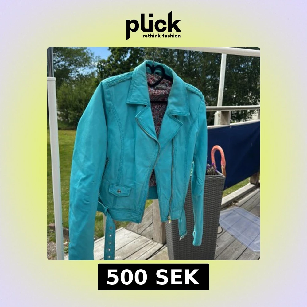 Snygg turkos skinnjacka från Jofama by Kenza med flätad detalj på axlarna, dragkedja framtill och bälte i midjan. Jackan har blommigt foder och coola metalldetaljer. Perfekt statement-piece för dig som vill sticka ut.