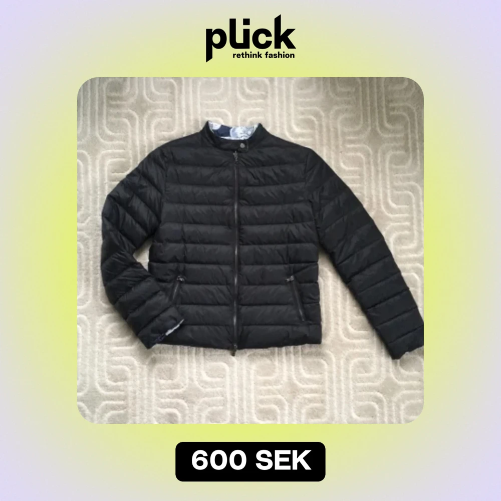 Underbar lätt och mjuk, vändbar dunjacka - perfekt för vår, höst och lite kyliga sommardagar! Original Emporio Armani. Mycket hög kvalitet. Italiensk Strl. 48, ca 40. Längd: 60 cm, br. 50 cm Tvä invändiga fickor. Blixtlåset är delbart åt båda håll