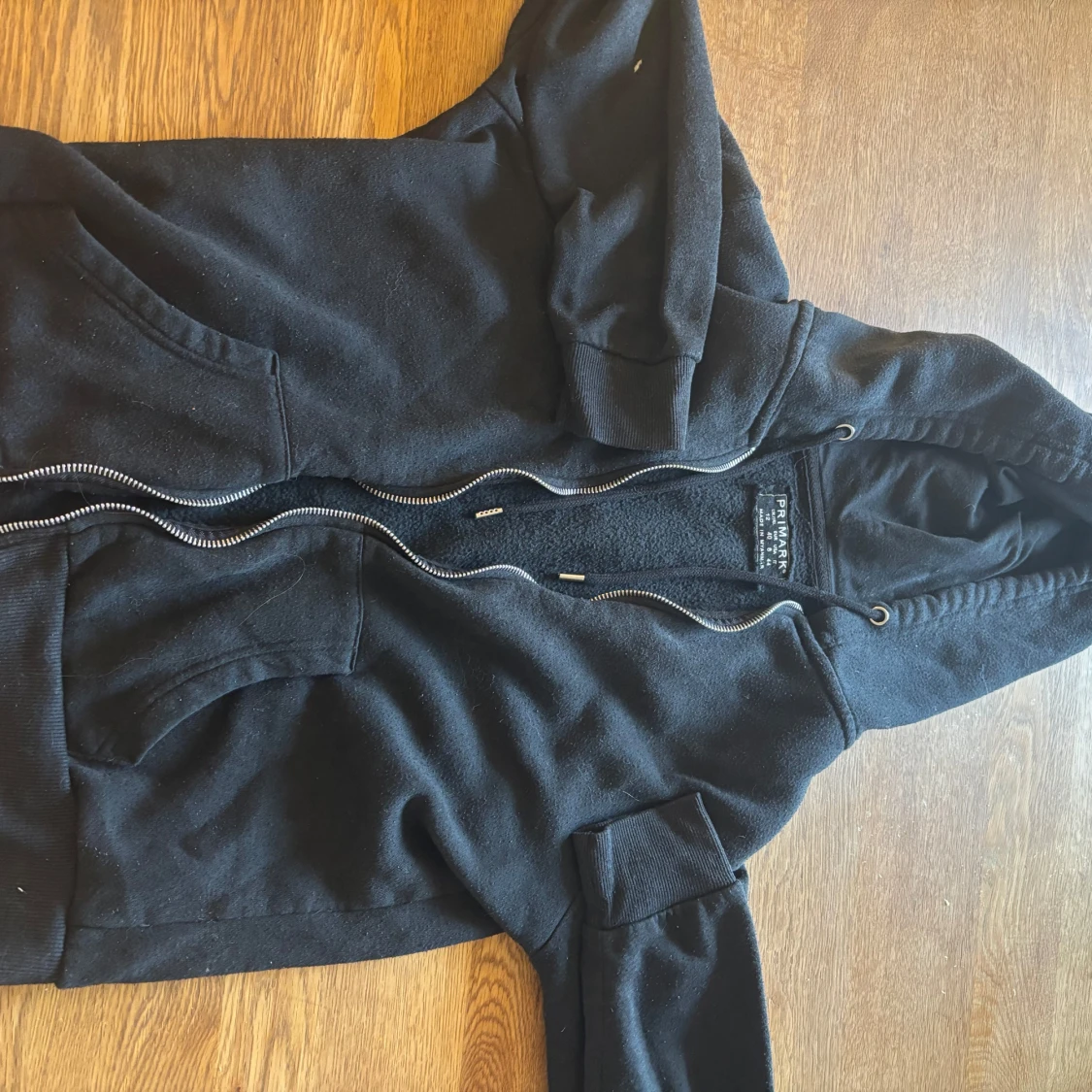 Säljer en svart hoodie från Primark med dragkedja och huva. Den har långa ärmar och praktiska fickor framtill. Perfekt för en avslappnad stil eller en lätt kofta över linnet/tshirt