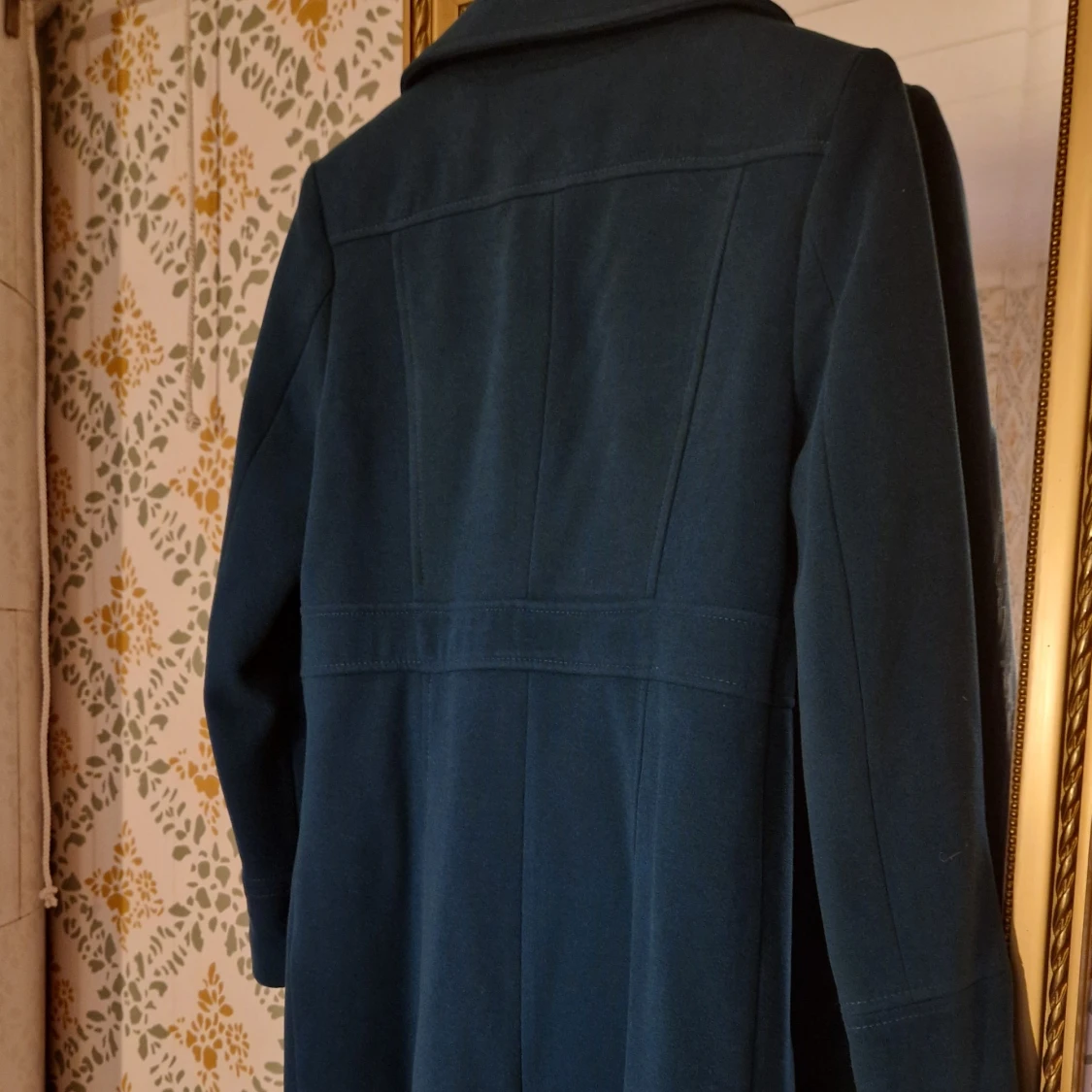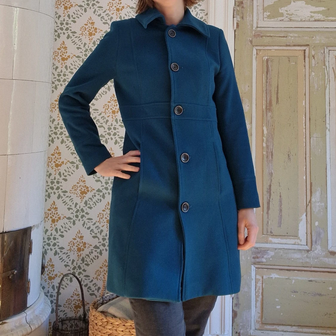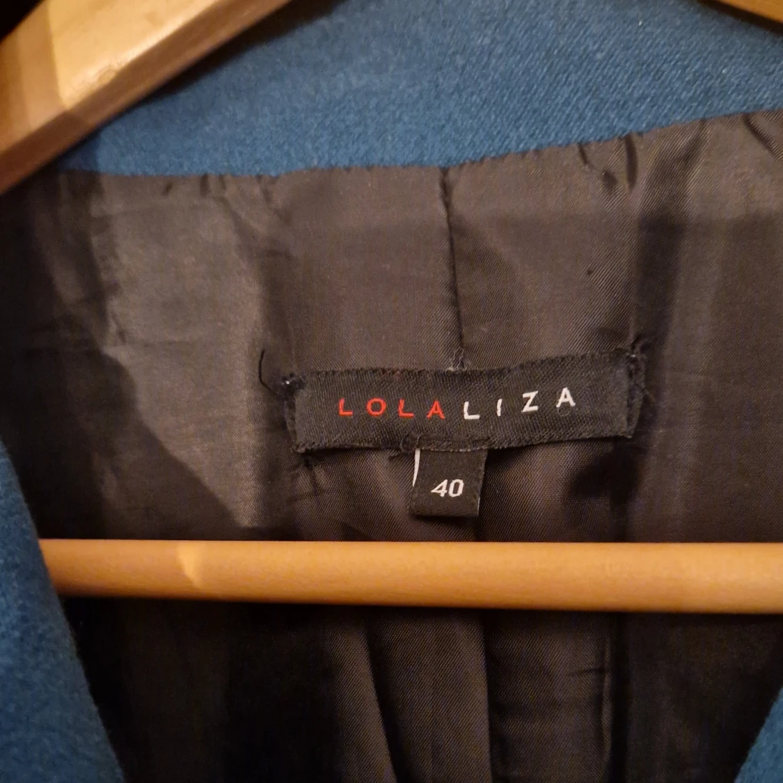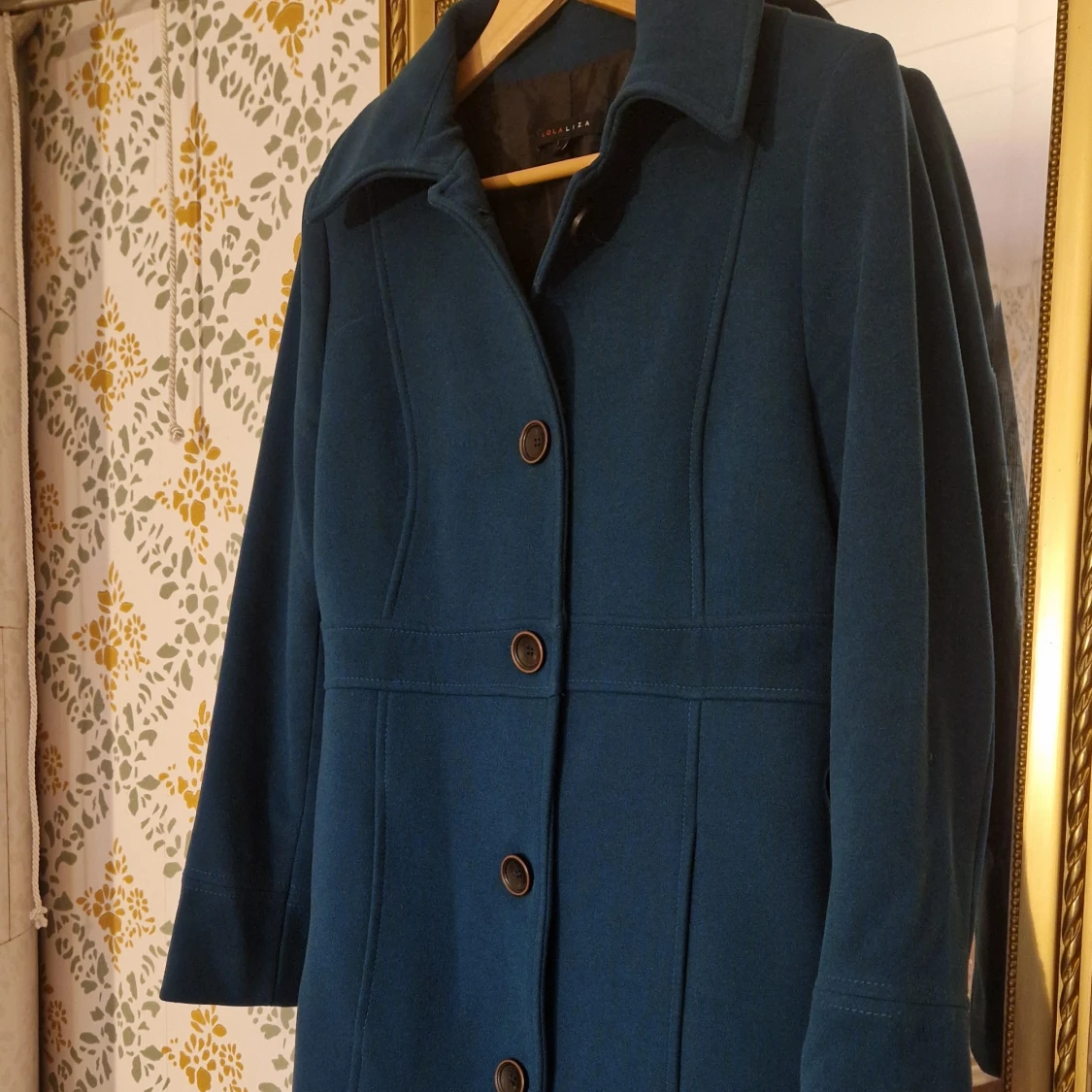 Säljer en snygg petrolblå kappa från LolaLiza i storlek 40, något liten i storlek och passar bäst på storlek 38. Jag på bild har storlek 40 upptill, 42 över höfter. Kappan har klassisk krage, raka linjer och stängs med stora knappar framtill. Materialet känns mjukt och varmt, perfekt för kyligare dagar. Enkel och stilren design som passar till många outfits. Inga anmärkningar. Nyskick.