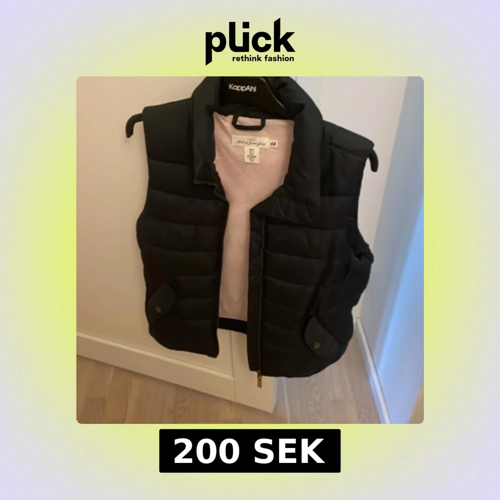 Svart dunväst från H&M L.O.G.G. med quiltad design och hög krage. Västen har dragkedja framtill och två fickor med lock och knappdetalj. Perfekt att slänga över en hoodie för en chill look.