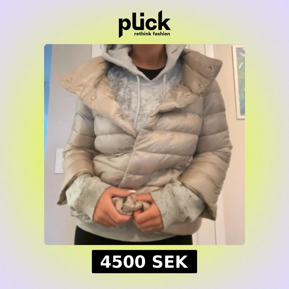 Ljus beige äkta herno jacka med trekvarts ärm och högkrage. Storlek 42 i italiensk strk och jag är ca 165 för referens, den sitter perfekt på mig och som man ser på bilden får jag plats med tjocktröja under. Köpt ny för 5999.