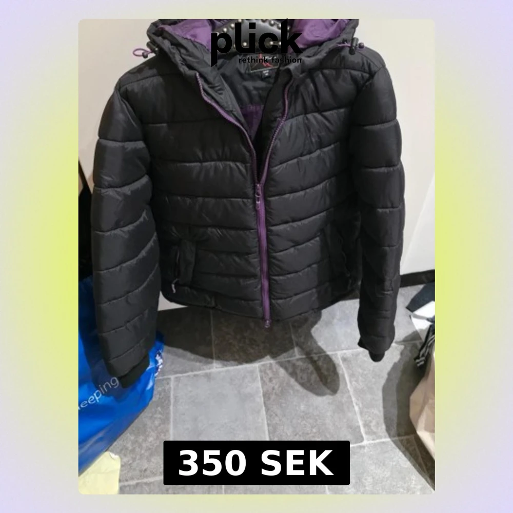 Säljer en svart pufferjacka från Engelsons med lila detaljer och huva. Jackan har quiltad design, dragkedja framtill och är fodrad med polyester. Perfekt för kalla dagar och har en snygg, sportig look med lila insida och detaljer.