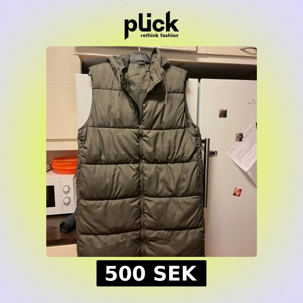 Lång, quiltad olivgrön dunväst från Stories med huva och dragkedja framtill. Västen har praktiska fickor i sidorna och en stilren, enkel design. Perfekt för lager-på-lager och snygg till både jeans och hoodies.