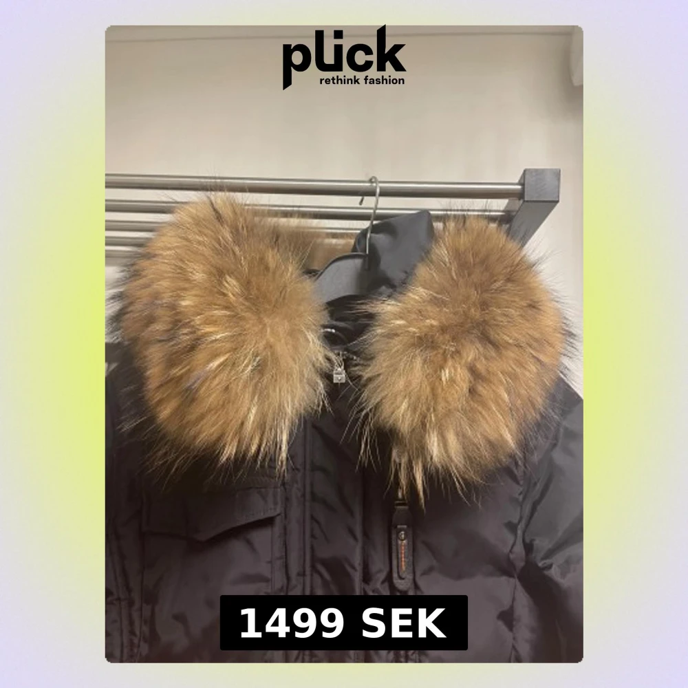 Snygg svart dunjacka från Hollies med stor fluffig brun päls runt kragen. Jackan har flera fickor med lock, dragkedja framtill och badge på ärmen. Perfekt för kalla dagar och har en riktigt schysst siluett som ger en cool vibe. Storlek 42, passar även 40. Enbart använd en vinter.