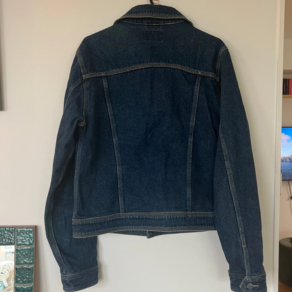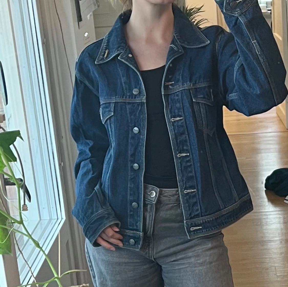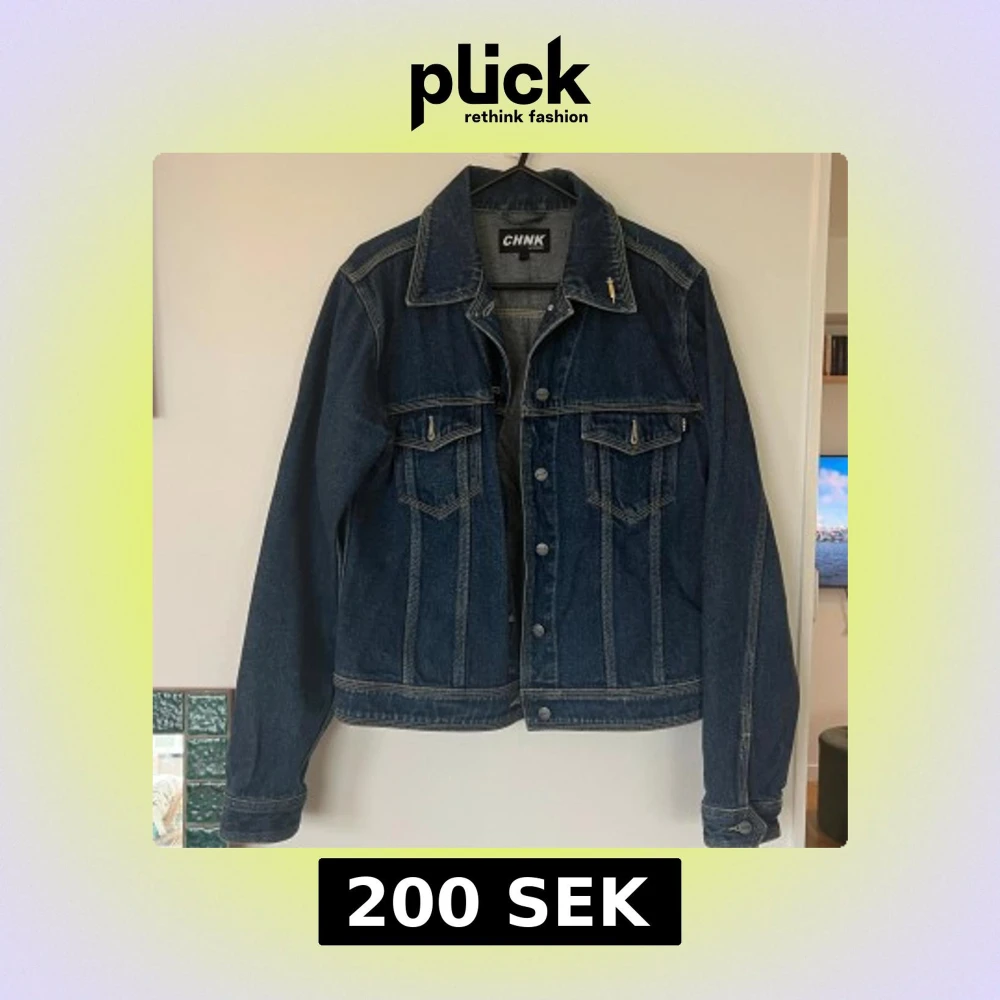 Säljer en klassisk mörkblå jeansjacka från CHNK med knappar framtill och två bröstfickor med lock. Jackan har en rak passform och tydliga sömdetaljer. Perfekt att slänga över en t-shirt eller hoodie.