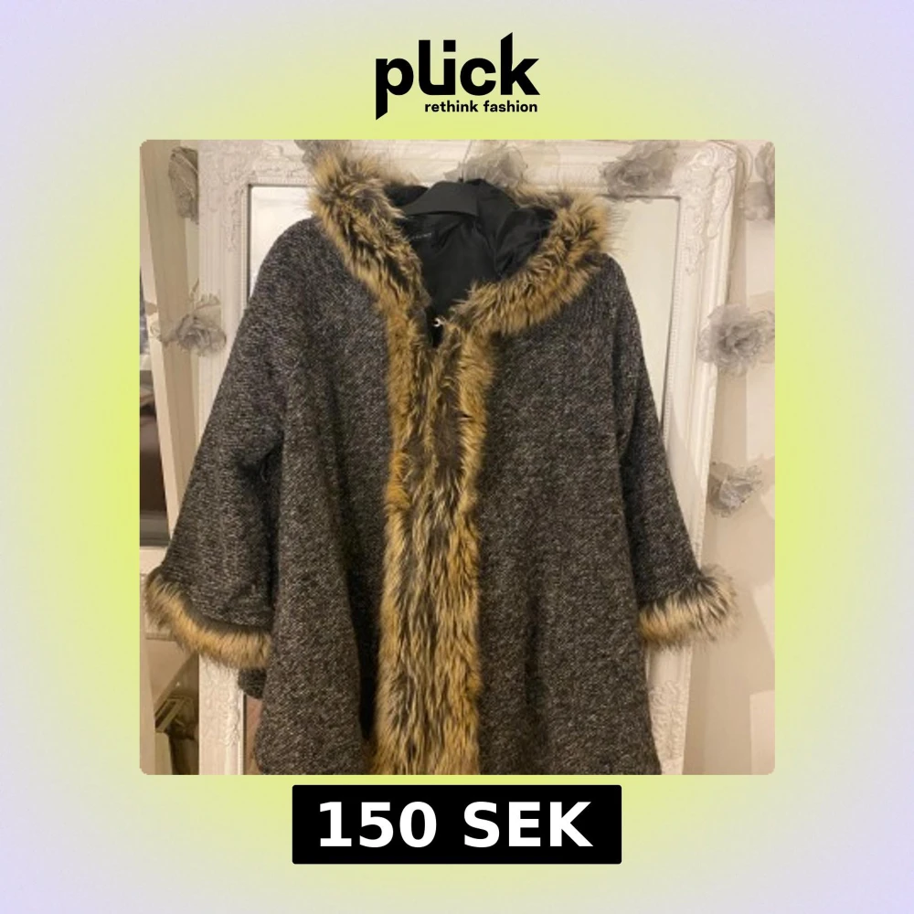 Säljer en snygg grå kappa med huva och breda ärmar, dekorerad med mjuk fuskpäls i bruna toner längs huva, ärmslut och framkant. Kappan har ett grovt vävt tyg och en loose passform, perfekt för kalla dagar när du vill vara både varm och stilren.