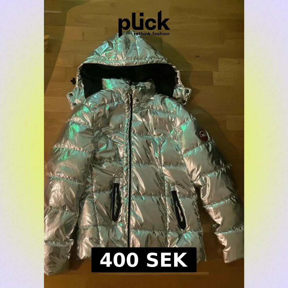 Säljer en silvrig pufferjacka med huva och svarta detaljer vid fickorna. Jackan har quiltad design, dragkedja framtill och ett märke på ärmen. Perfekt för dig som vill sticka ut i vinter och hålla dig varm. Jackan är aldrig använd!
