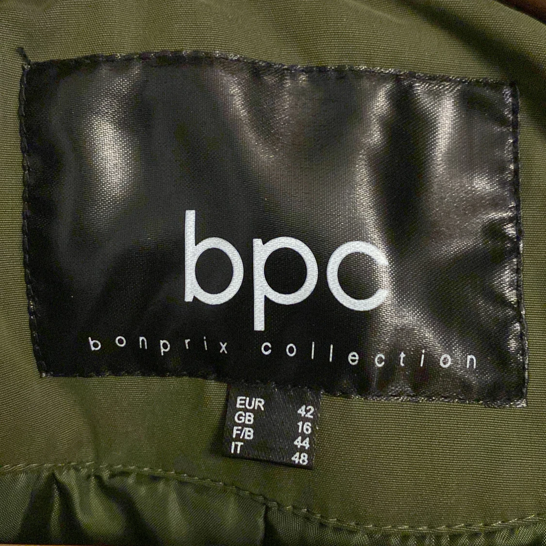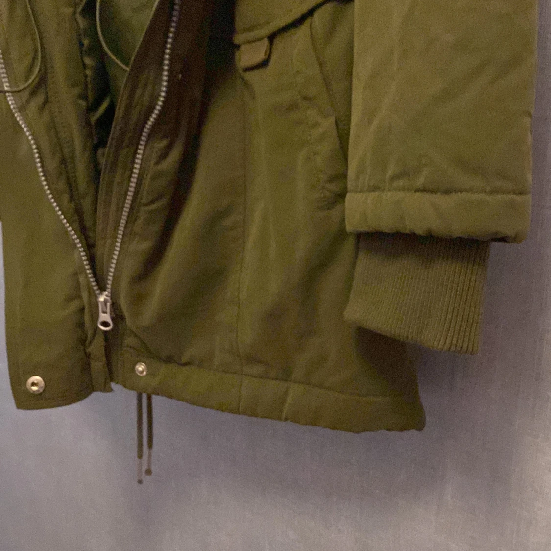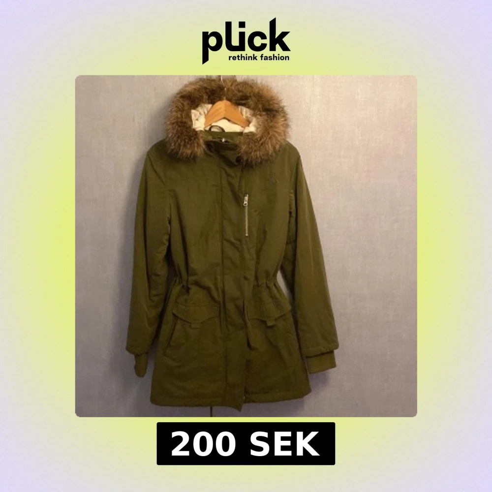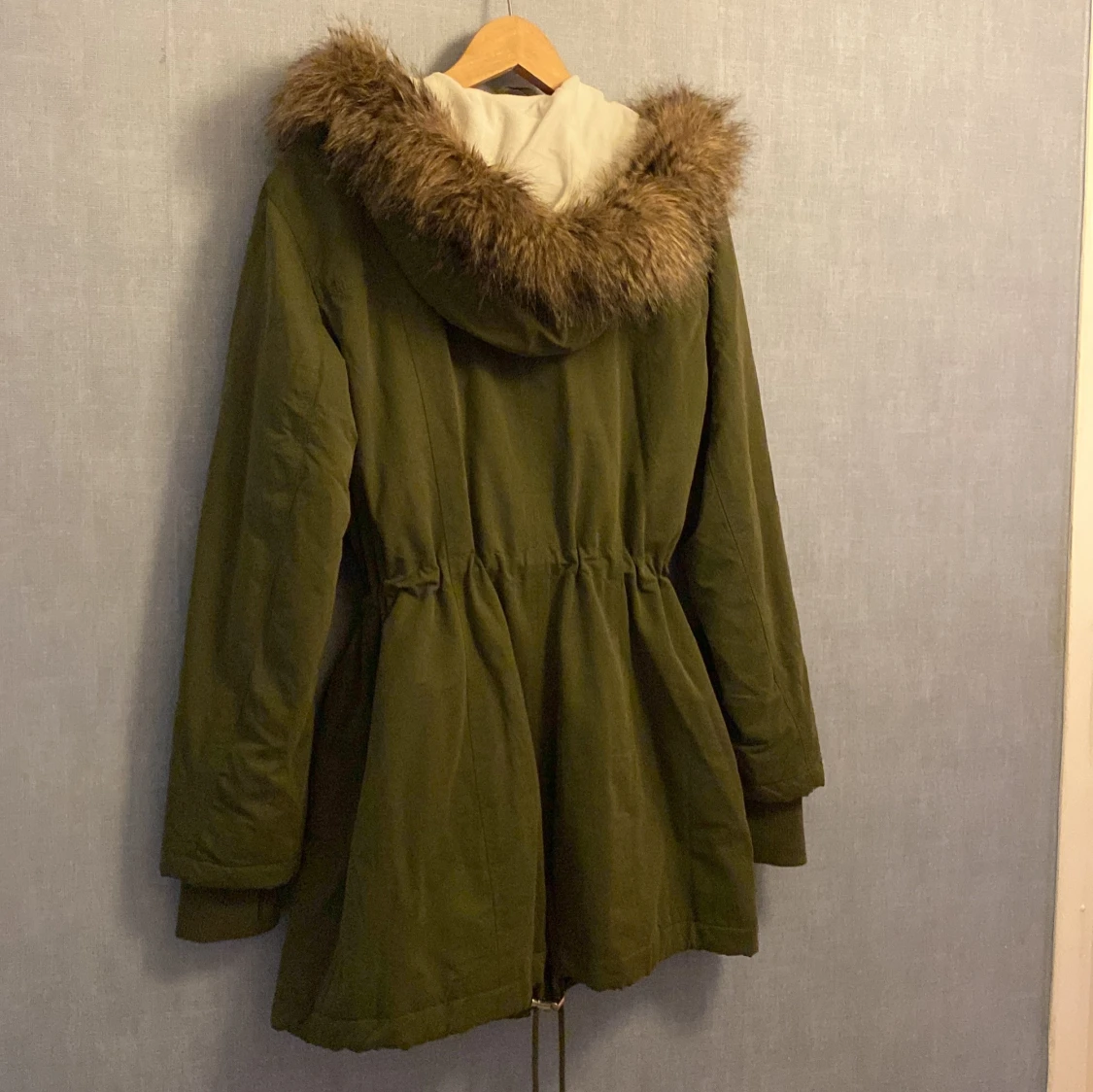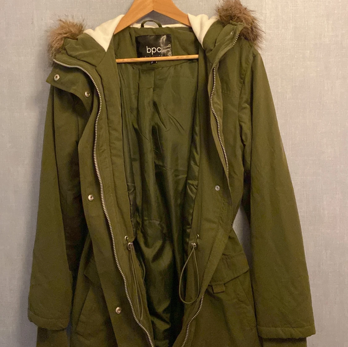 Olivgrön parkas från bpc med huva och fuskpäls, dragsko i midjan och flera fickor. Jackan har långa ärmar, dragkedja och knappar framtill. Perfekt för kalla dagar med sin varma och mysiga känsla.