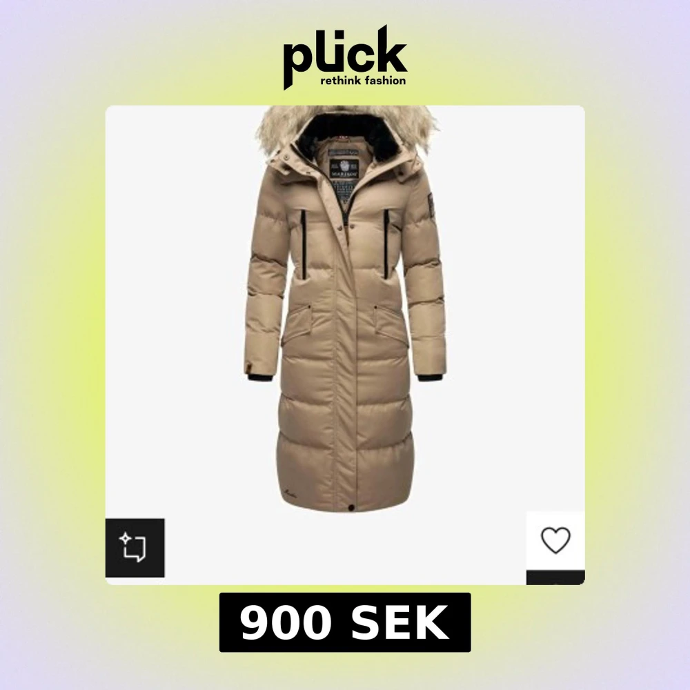 Snygg beige lång dunjacka från Marikoo med avtagbar huva och pälsdetaljer. Jackan har dragkedja och knappar framtill, samt praktiska fickor. Perfekt för kalla vinterdagar.