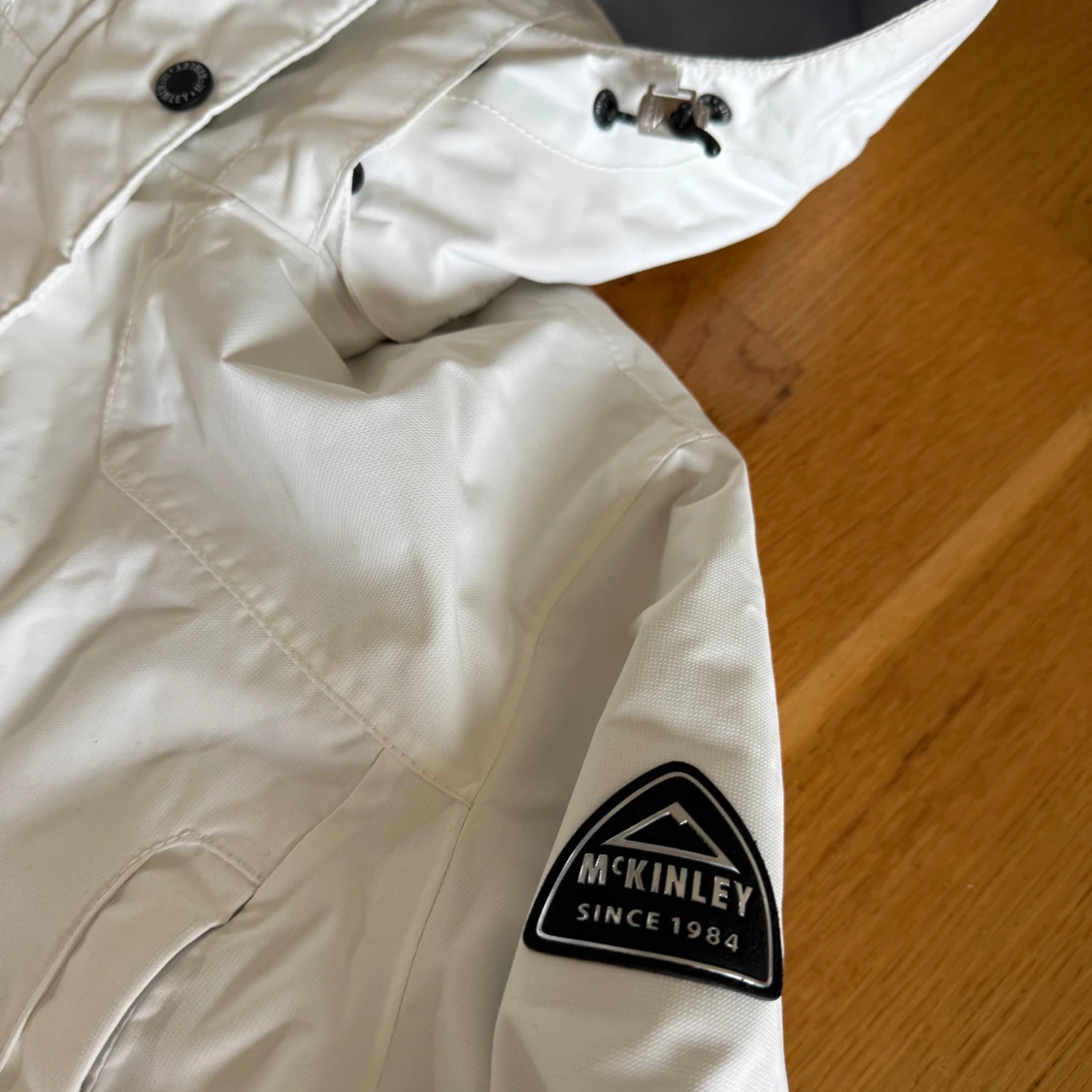 Snygg vit vinterjacka från McKinley med huva och stora fickor framtill. Jackan har dragkedja och knappar, samt justerbar avtagbar huva med snörning. Perfekt för kalla dagar och har en stilren look med svart logotyp på ärmen.