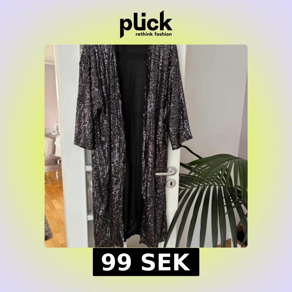 Lång svart kappa täckt av silvriga paljetter som ger en riktigt glittrig och festlig känsla. Modellen är öppen framtill, har trekvartsärmar och en loose passform. Perfekt för dig som vill sticka ut och glänsa lite extra.