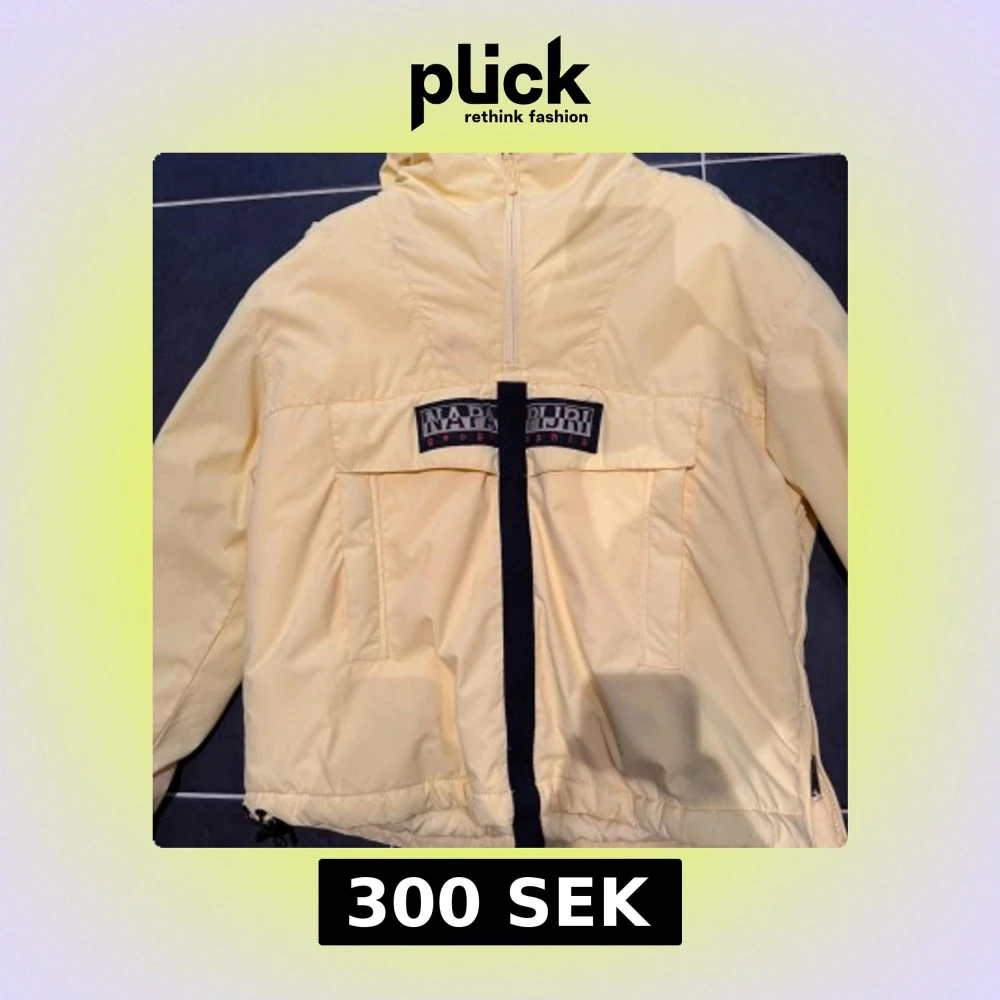 Snygg ljusgul vindjacka från Napapijri med huva och dragkedja framtill. Jackan har en stor logga på bröstet, praktiska fickor och justerbar nederkant med snörning. Perfekt för dig som vill ha en stilren och sportig look. Passar s/m