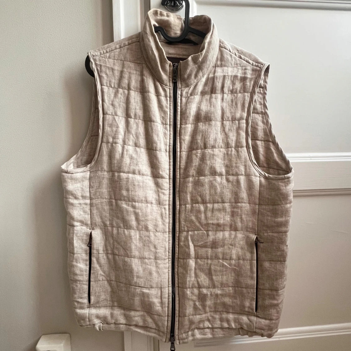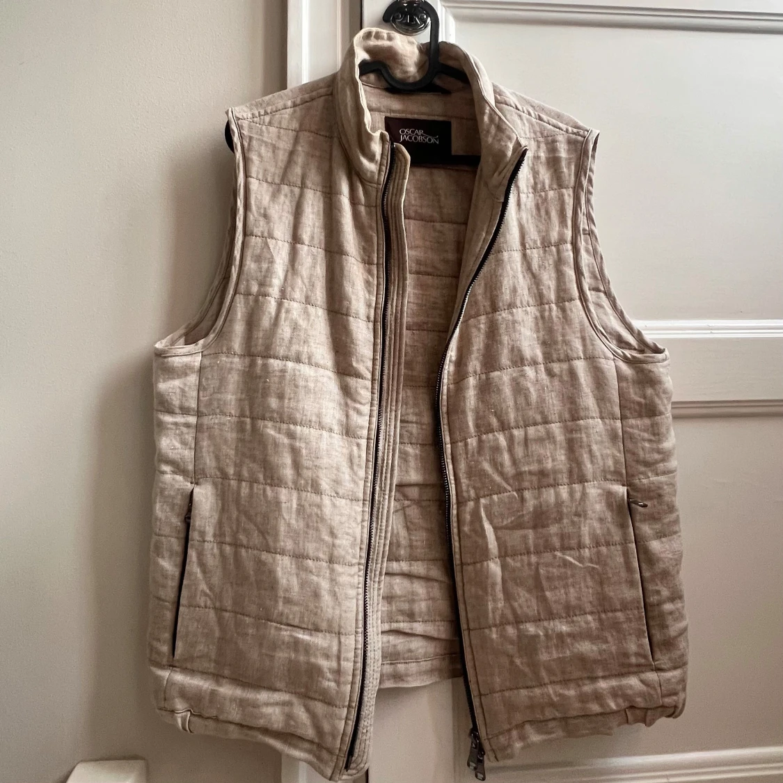 Säljer en stilren beige quiltad väst från Oscar Jacobson. Perfekt för lager-på-lager under kyligare dagar men även på vår, sommar och höst. Inneficka finns. Nypris ca 3000.