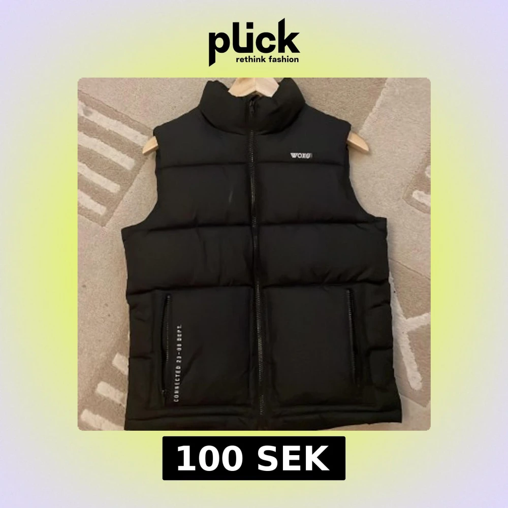 Svart dunväst från WOXO Urban Streetwear med hög krage och två fickor med dragkedja. Västen har ett stilrent, quiltat mönster och tryck med logga på bröstet och nedre delen. Perfekt för lager-på-lager och streetstyle.