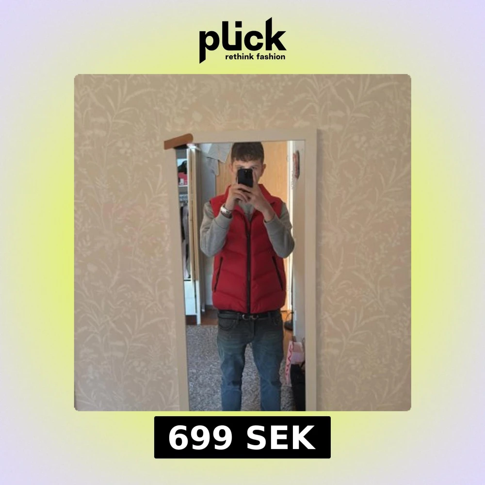 Snygg röd och puffig dunväst från Rockandblue med svart dragkedja och svarta detaljer vid fickorna. På Insidan finns det två inre dragkedjefickor samt en röd ficka längre ned på högersida och Rockandblue-tryck. Perfekt att slänga över en hoodie tidig vår samt höst. Personen på bild är ca 1m 80cm lång och väger runt 65-67kg, säljs då den ej kommer till användning. (Pris går att diskutera)