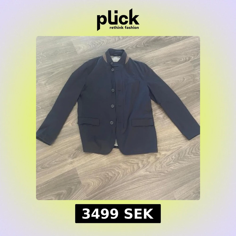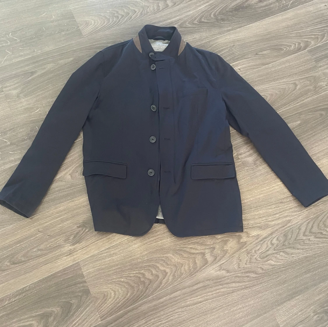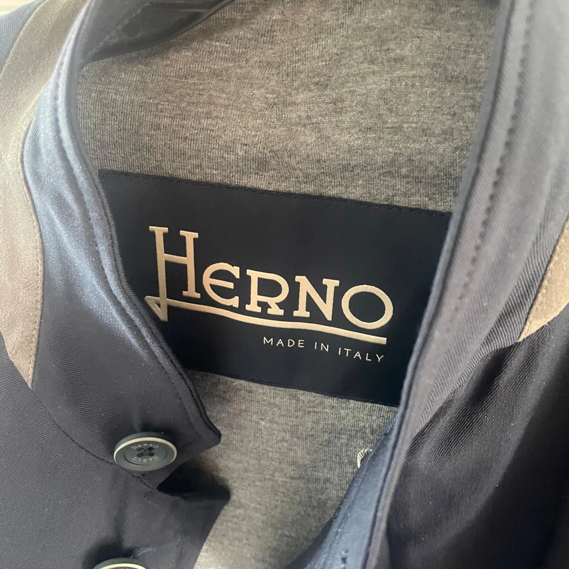 Snygg mörkblå kavajjacka från Herno med exklusivt Rain System-tyg från Loro Piana. Jackan har bruna detaljer på kragen, knäppning framtill och två fickor med lock. Perfekt för dig som gillar stilren och italiensk design.