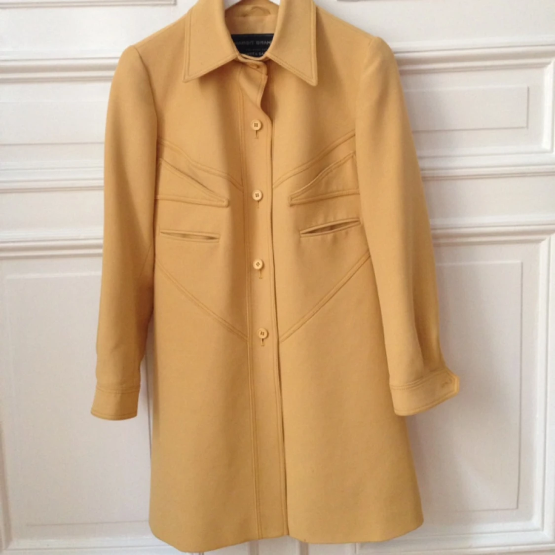 Solgul kappa från Margit Brandt. Figursydd i 60-tals stil. Aldrig använd och passar till både sommarkvällar och till tidig höst.