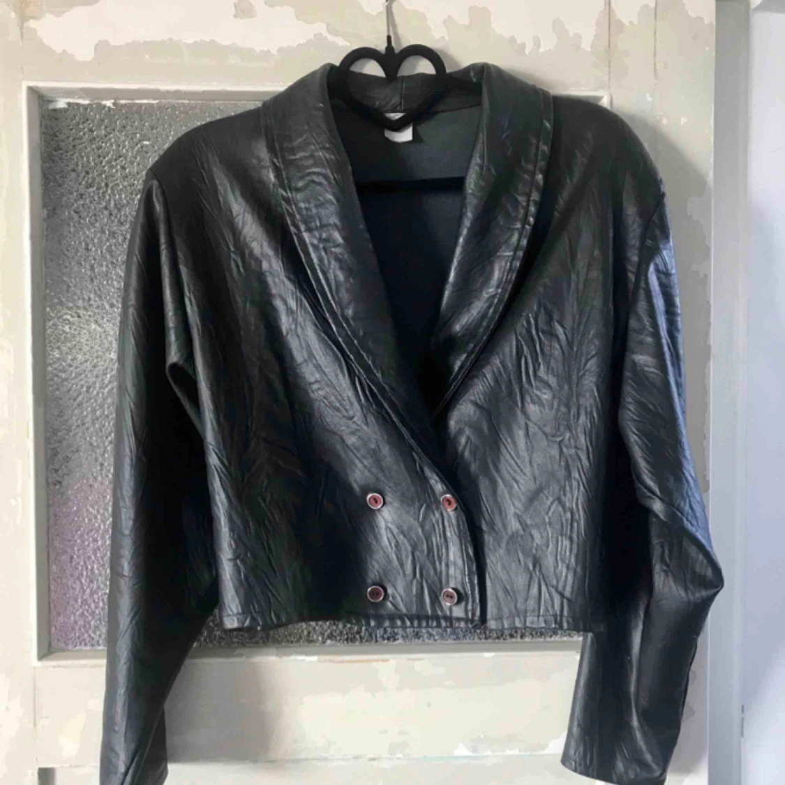 Kort fejkläder jacka. En aning 80’s med lite bredare axlar och kort. Handsydd.