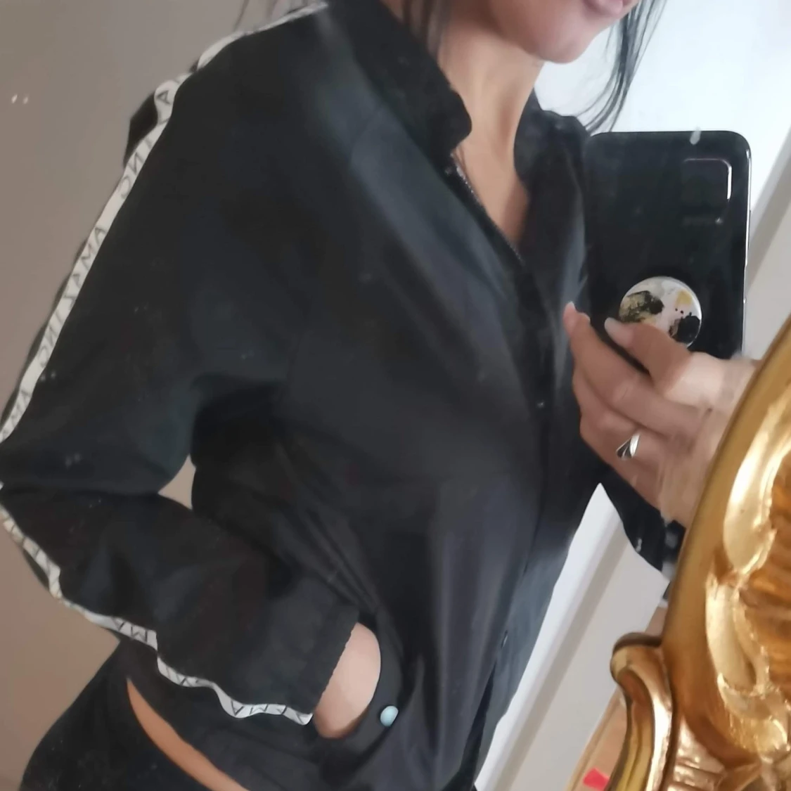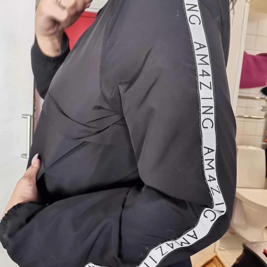 Enkelt svart täckjacka med vit rand med text på både armarna, strl xs.. Köpare står för frakt