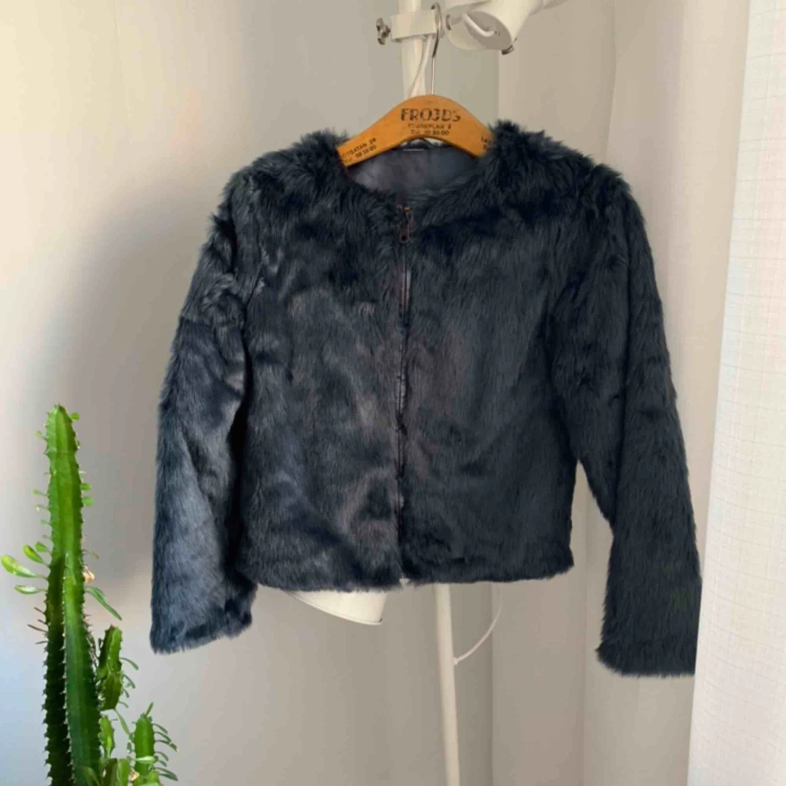 Petrolblå jacka. Relativt tunn. Fuskpäls. Storlek XS