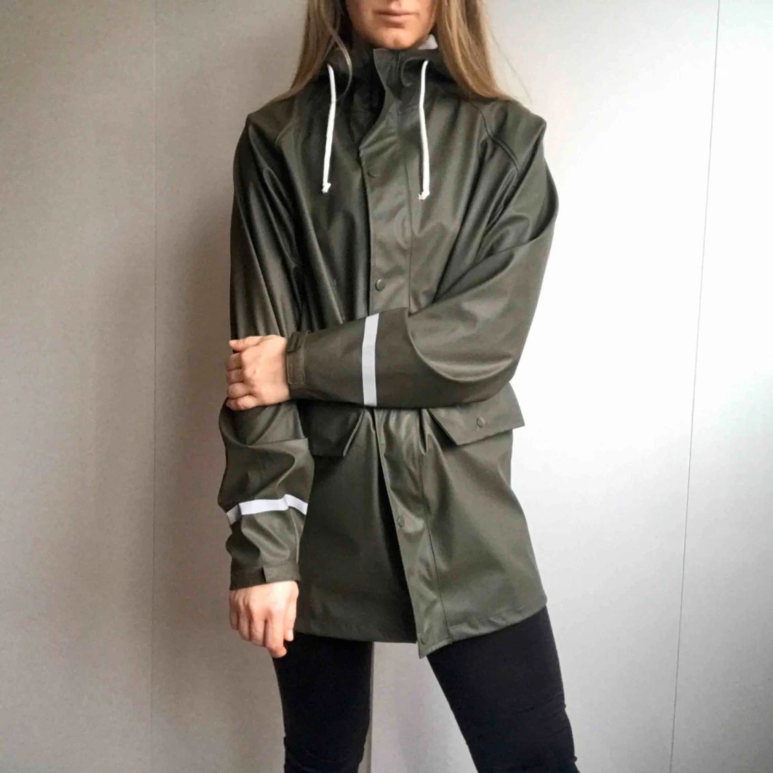En grön regnjacka med reflexer. Tyvärr fått lite målarfärg på framsidan (bild 3) Jag är 172 och bär storlek S. Köparen står för eventuell portokostnad.