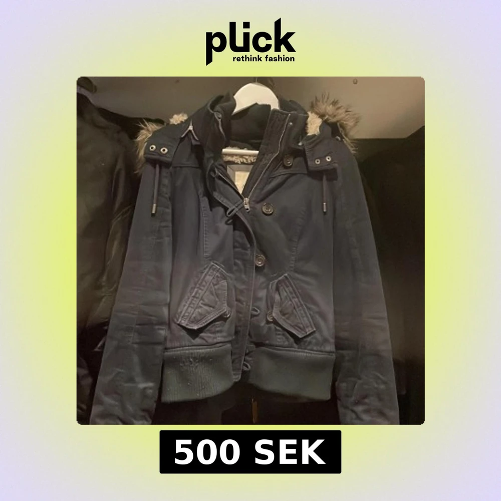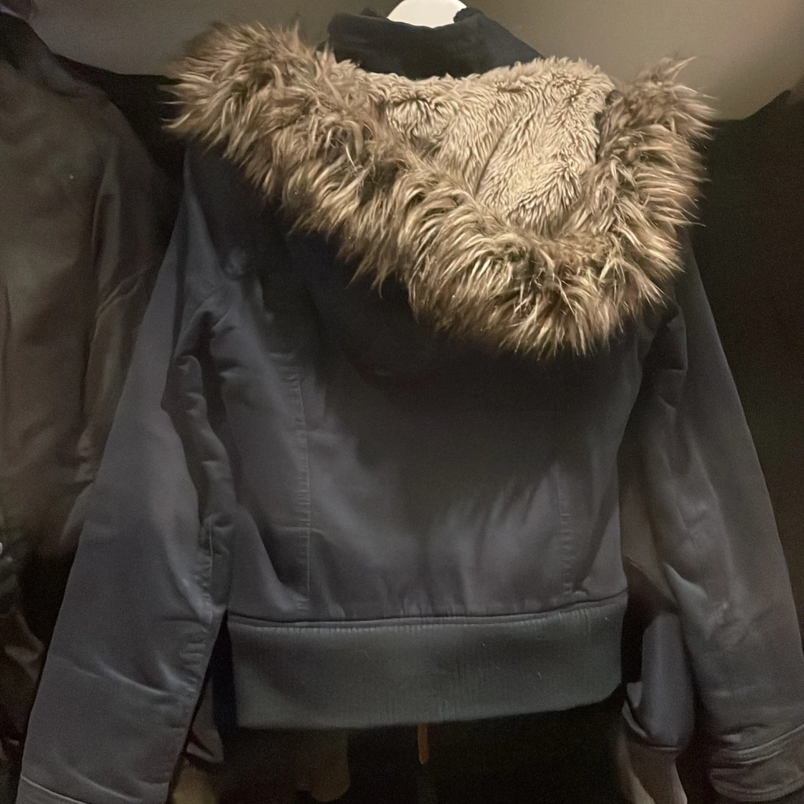 Snygg mörkblå jacka med huva och fuskpäls från Abercrombie & Fitch. Jackan har dragkedja, knappar och ribbade muddar. Perfekt för kyligare dagar med sin varma huva och trendiga look. Dragkedjan är lite sönder så de kan va svårt att stänga men man måste vbara knepa lite men dragkedjan går att byta för typ 50kr hos skräddare.