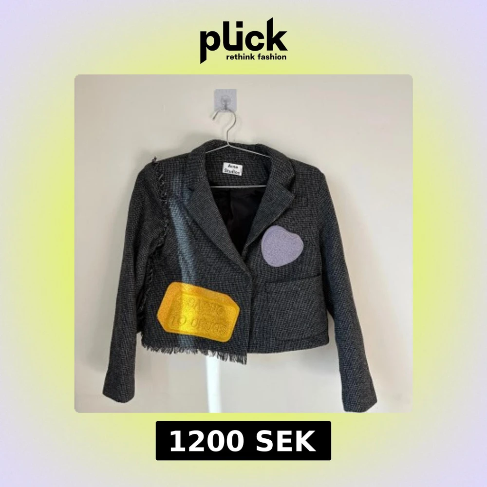 Unik rutig kavaj från Acne Studios i grå toner med croppad passform och fransad nederkant. Jackan har stora broderade patches, en gul med texten 'SAY NO TO DRUGS' och en lila hjärtformad patch. Materialmix av ull, nylon, kashmir och elastan.