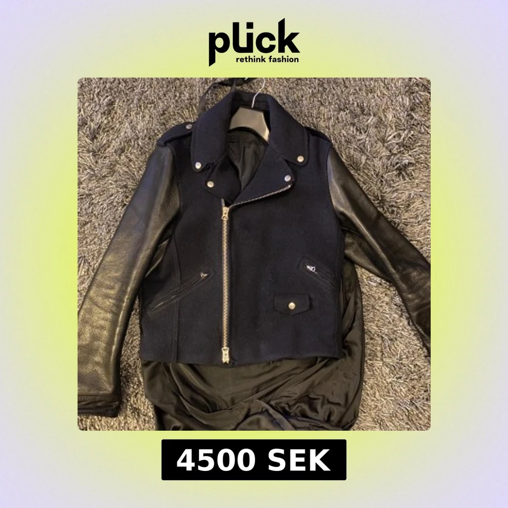 Säljer en svart bikerjacka från Acne Studios med ullig kropp och ärmar i skinn. Jackan har silvriga dragkedjor, klassisk krage och flera fickor framtill. Snygg och stilren modell som ger en cool look.