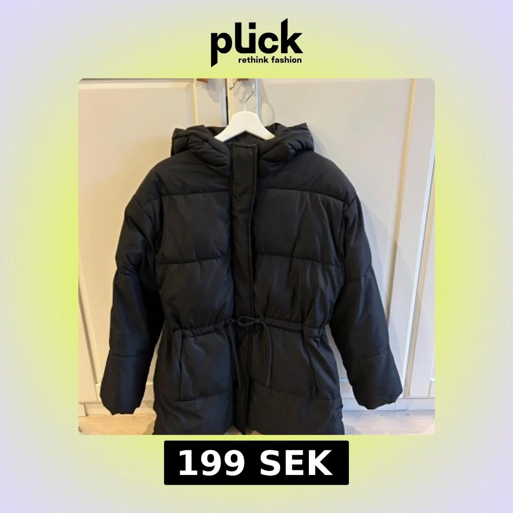 Snygg svart pufferjacka med huva och dragsko i midjan. Jackan har långa ärmar och quiltad design, perfekt för kyliga dagar. Den är både stilren och praktisk med en bekväm passform.