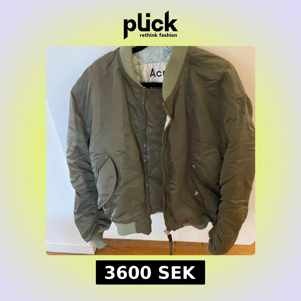 Olivgrön bomberjacka från Acne Studios. Jackan har en klassisk bomberjacka-design med ribbade muddar och krage. Den har en dragkedja fram och fickor på sidorna. Jackan är i riktigt fint skick. Rökfritt hem. Skickar paket som spårbart.