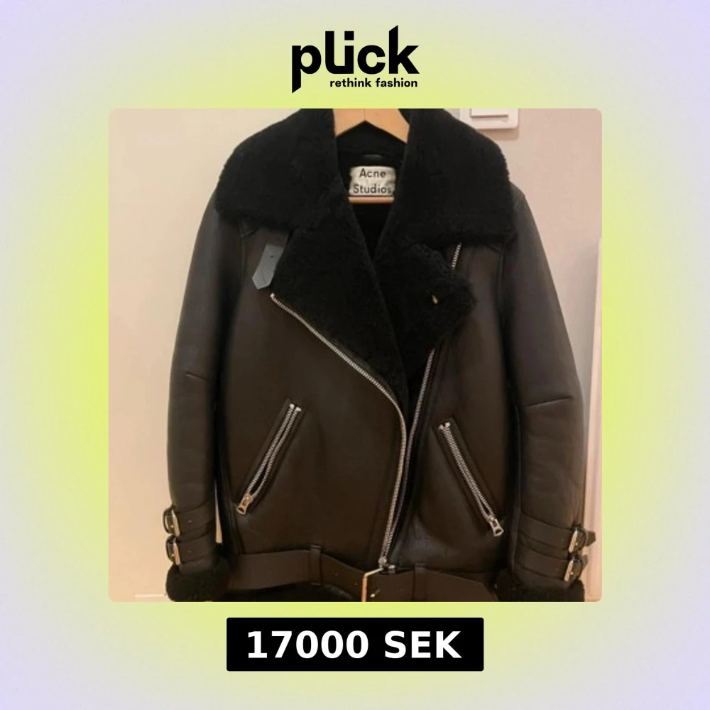 Nypris är 29 000kr. Riktigt fet svart pälsjacka från Acne Studios med bred krage, bälte i midjan och coola dragkedjor. Jackan är gjord i äkta lammull och skinn, har stora fickor och snygga spännen vid ärmsluten. Perfekt för dig som vill sticka ut med en lyxig och tidlös look.