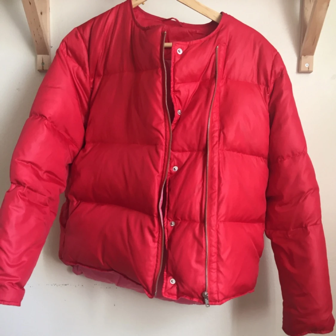Finaste Acnejackan. Röd dunjacka med rosa foder. Biker-knäppning och två fickor samt en innerficka. Knappt använd! Det är en tunnare jacka, perfekt vår/höst.