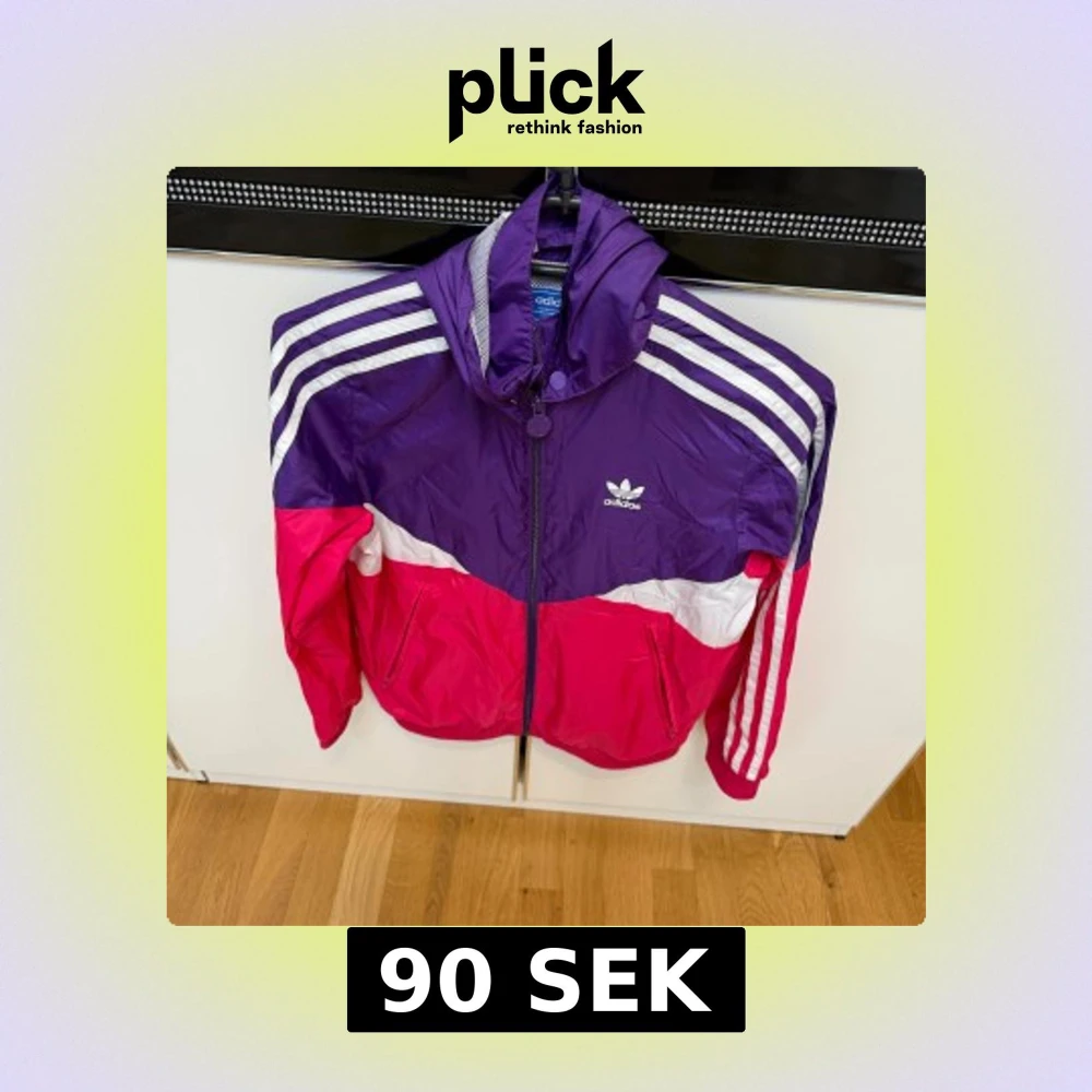 Säljer en snygg Adidas vindjacka i lila, rosa och vitt med klassiska ränder på ärmarna. Jackan har huva, dragkedja framtill och två fickor med zip. Perfekt för dig som gillar sportig stil och färg. Adidas-logga på bröstet och meshfoder i huvan.