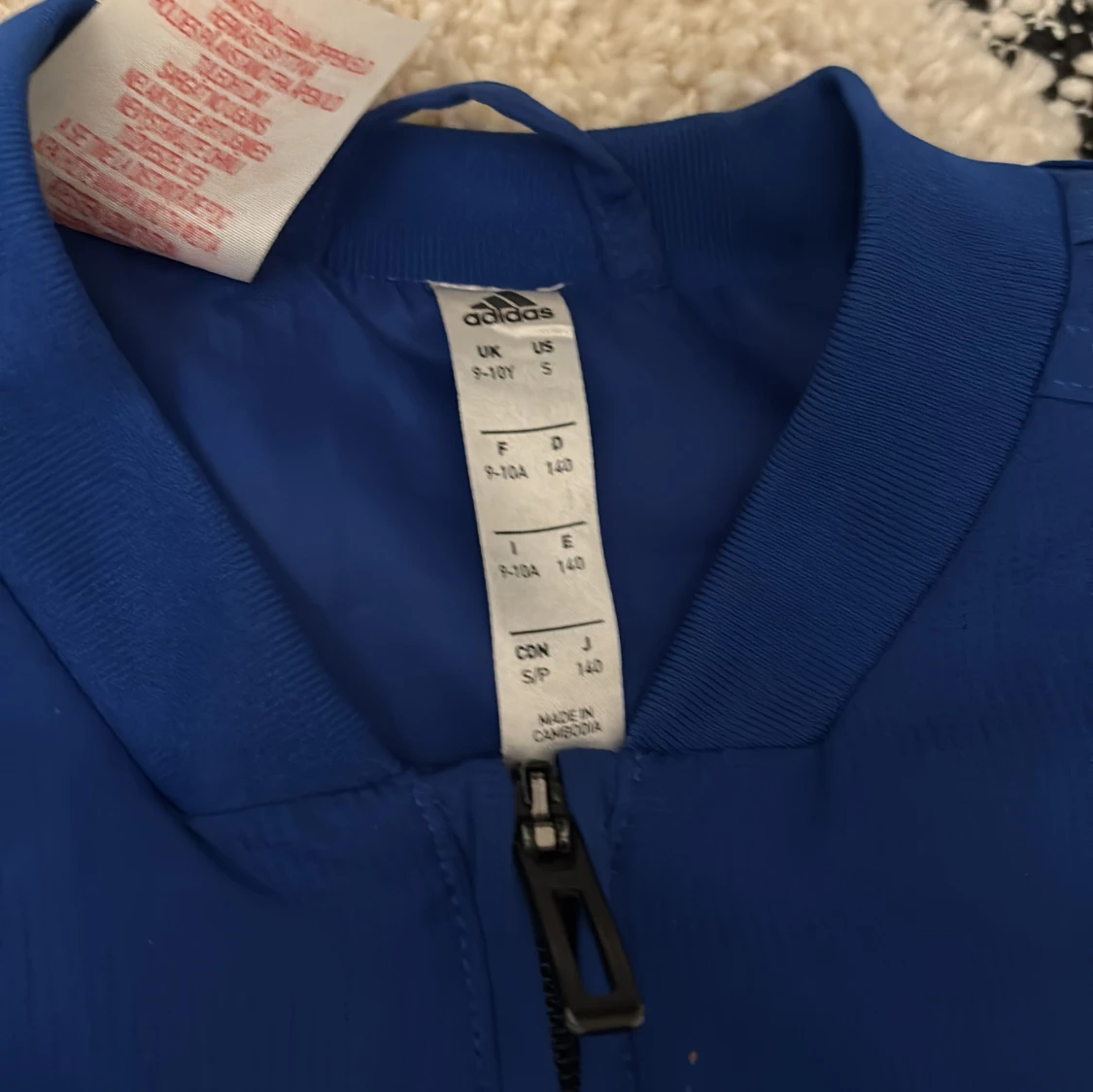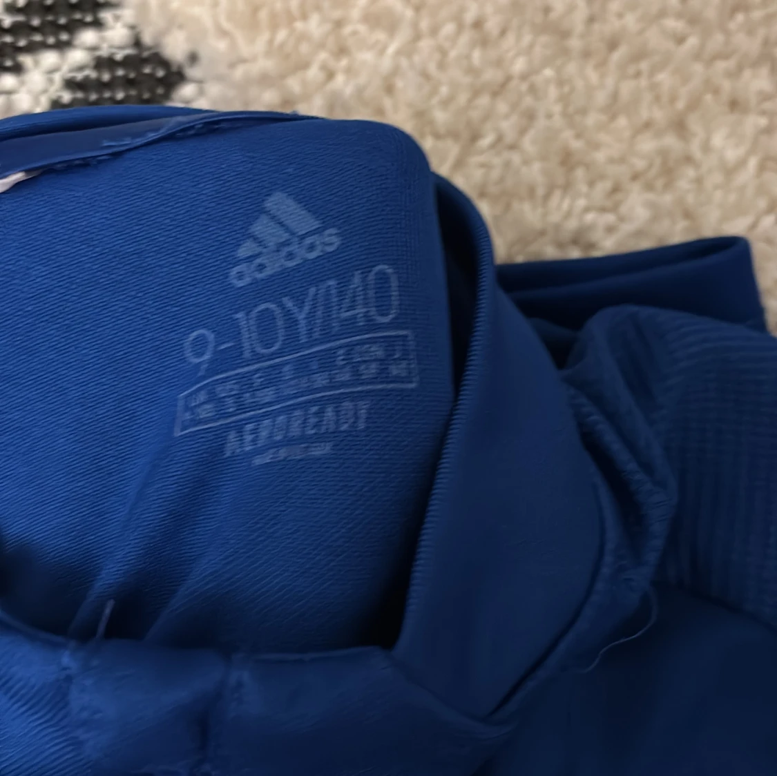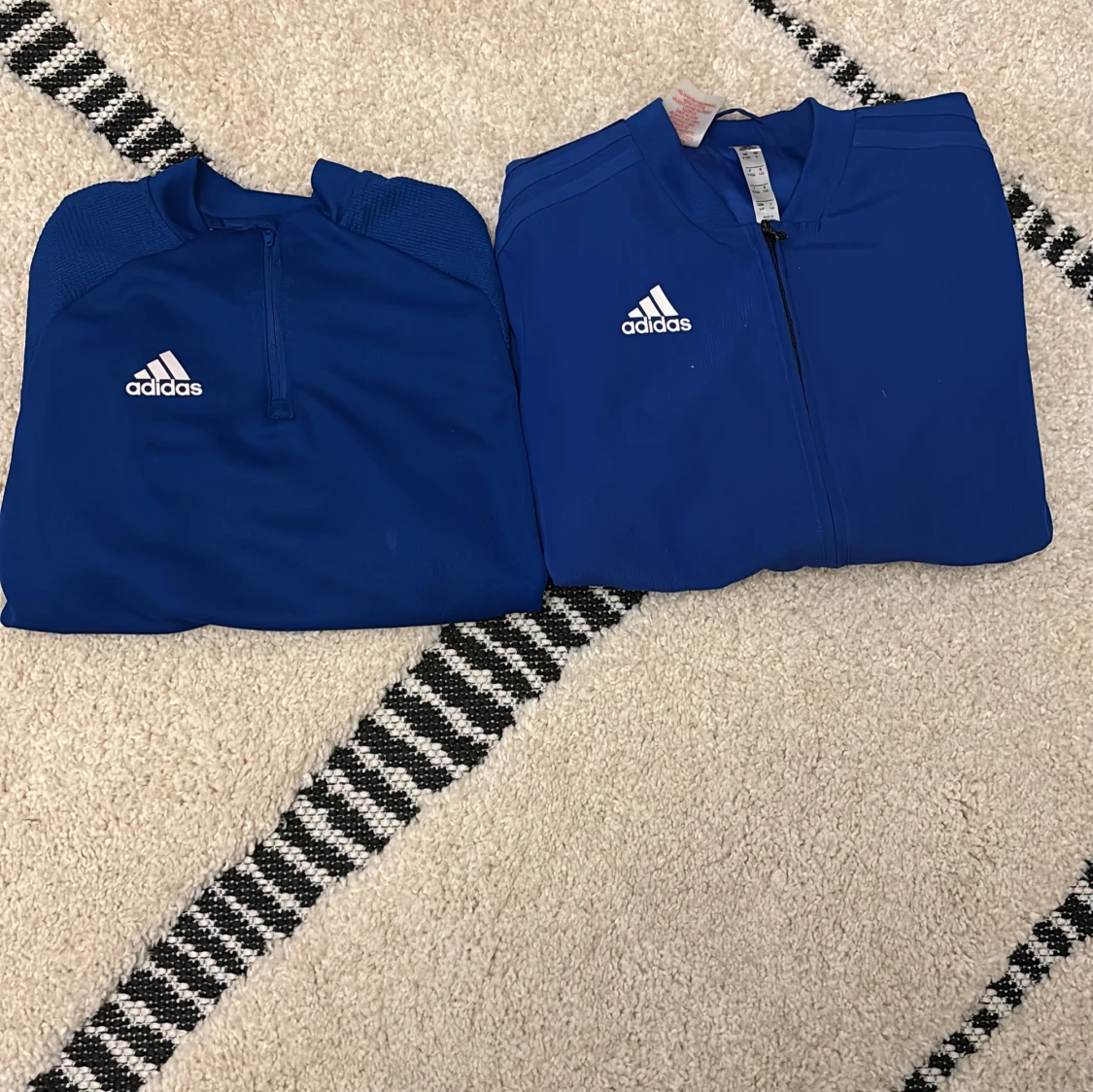 Två blå träningsjackor från adidas i storlek 140. Ena jackan har dragkedja hela vägen och den andra har half zip. Båda har klassisk adidas-logga på bröstet och är gjorda i ett lätt, sportigt polyestermaterial. Perfekta för träning eller chill.