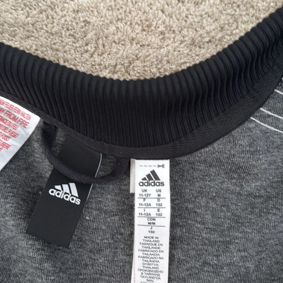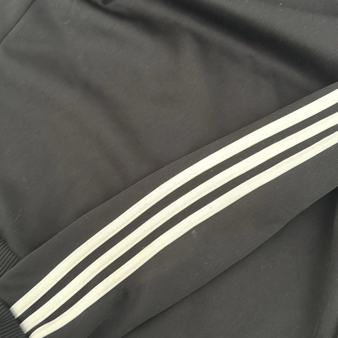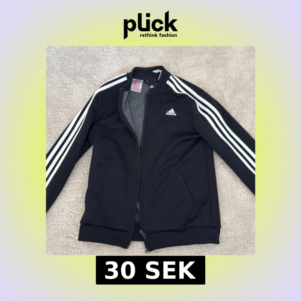 Svart bomberjacka från Adidas med klassiska vita ränder längs ärmarna och Adidas-logga på bröstet. Jackan har dragkedja framtill, ribbade muddar och två fickor. Perfekt för en sportig och avslappnad stil.