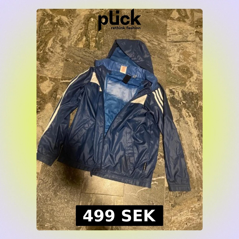 Snygg blå vindjacka från Adidas med klassiska vita ränder längs ärmarna och vit detalj över bröst och rygg. Jackan har huva, dragkedja framtill och meshfoder på insidan. Perfekt för blåsiga dagar och sportiga outfits. Storleken är junior 164.