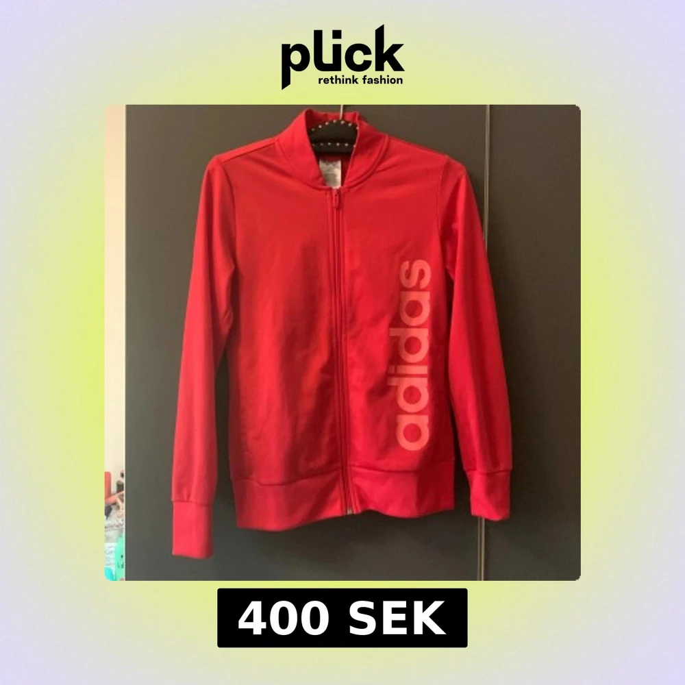 Säljer en snygg rosa-röd träningsjacka från Adidas med dragkedja framtill och stort tryck på sidan. Jackan har långa ärmar och en bekväm passform, perfekt för sport och fritid. Passar både för träning och som en stilren vardagsjacka.🩷