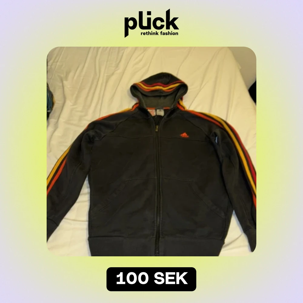 Säljer en svart huvtröja från Adidas med dragkedja och färgglada ränder i rött, gult och orange längs ärmarna. Tröjan har en huva och är långärmad. Perfekt för träning eller vardagsbruk.