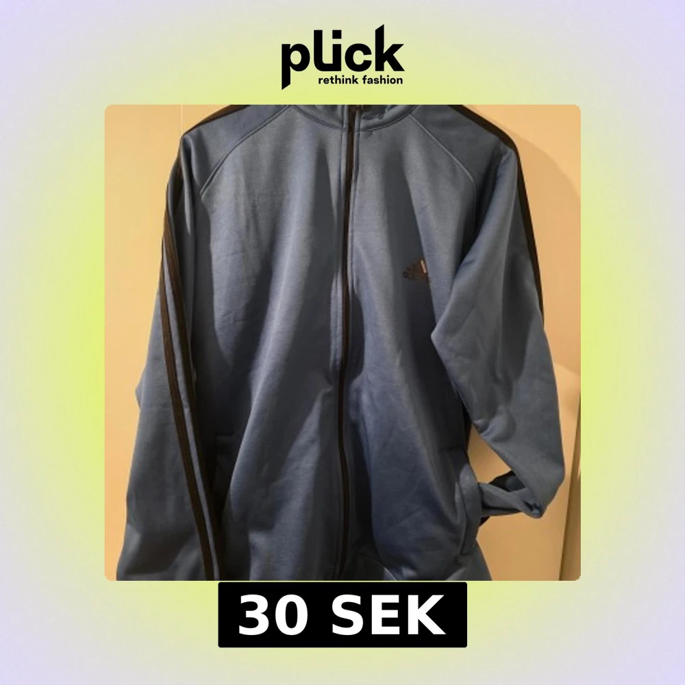 Säljer en blå Adidas track jacket med svarta ränder längs ärmarna och dragkedja framtill. Klassisk sportig look med hög krage och diskret Adidas-logga på bröstet. Perfekt för en avslappnad stil. Storlek Xl kanske