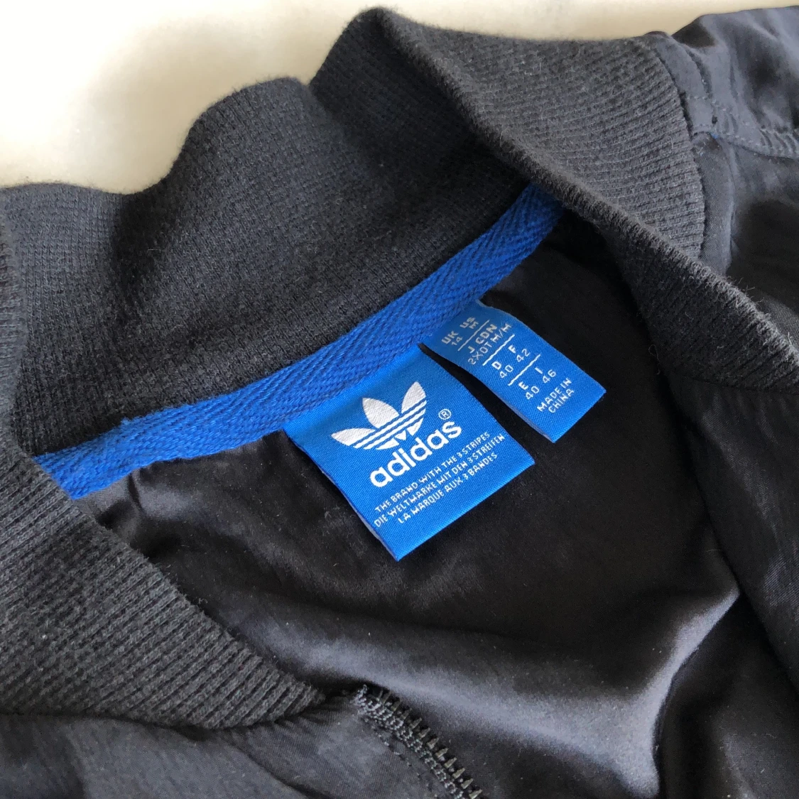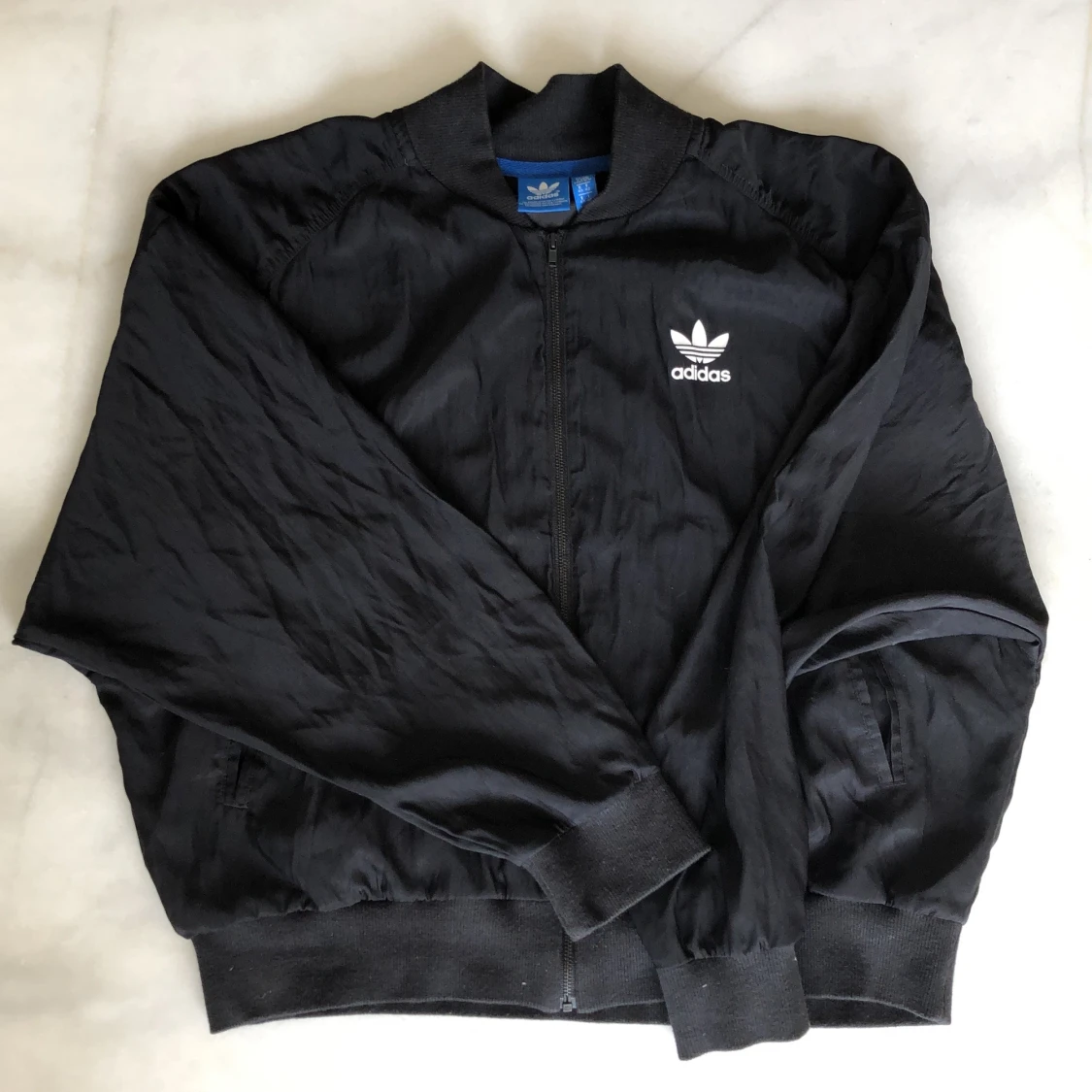 Adidas jacka i tunt material med stort tryck på ryggen. Oversize modell så passar flera storlekar. Använt men fint skick. Frakten är spårbar och inräknad i priset