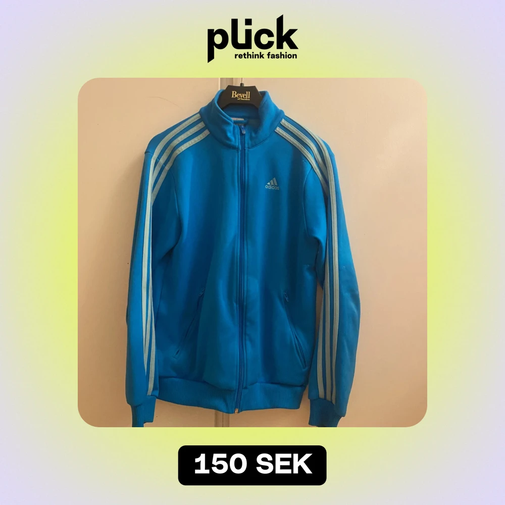 Säljer en snygg blå träningsjacka från Adidas i mycket bra skick. Jackan har de klassiska tre ränderna längs ärmarna och en dragkedja framtill. Perfekt för träning eller som en casual vardagslook. Den är långärmad och gjord i ett bekvämt syntetmaterial.